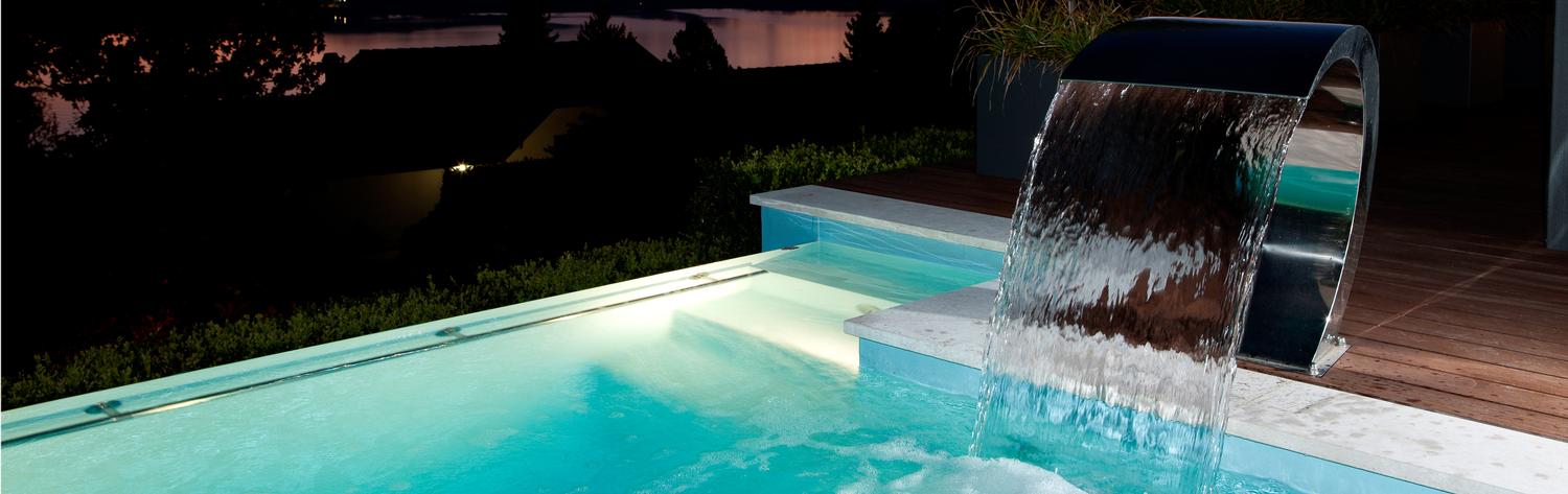 Schwallduschen gibt es in den unterschiedlichsten Größen, Formen, Austrittswinkeln und Materialbeschaffenheit. Sie können zum Einen am Beckenrand montiert oder auch in einer hinter dem Schwimmbad liegenden Natursteinmauer versteckt integriert sein, so dass die optische Illusion entsteht, als ergieße sich der Wasserfall „ganz natürlich" aus der Steinmauer direkt in Ihren Pool.